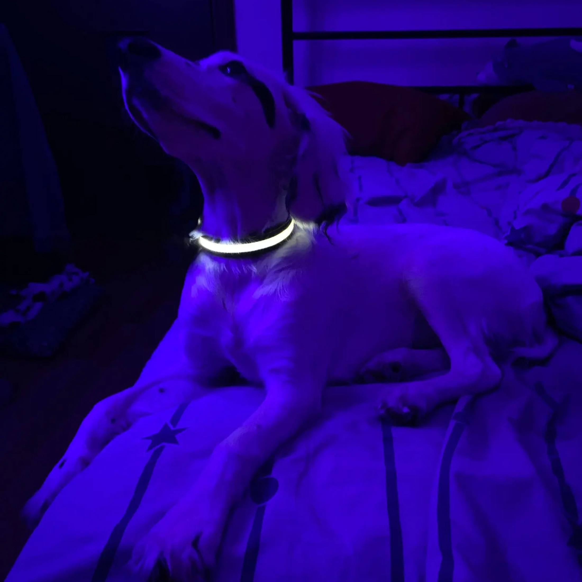 "I love this collar! It’s bright enough that I can spot my dog across the park after dark. Charging is super easy and it lasts our whole evening walk. Total game-changer for night safety!"