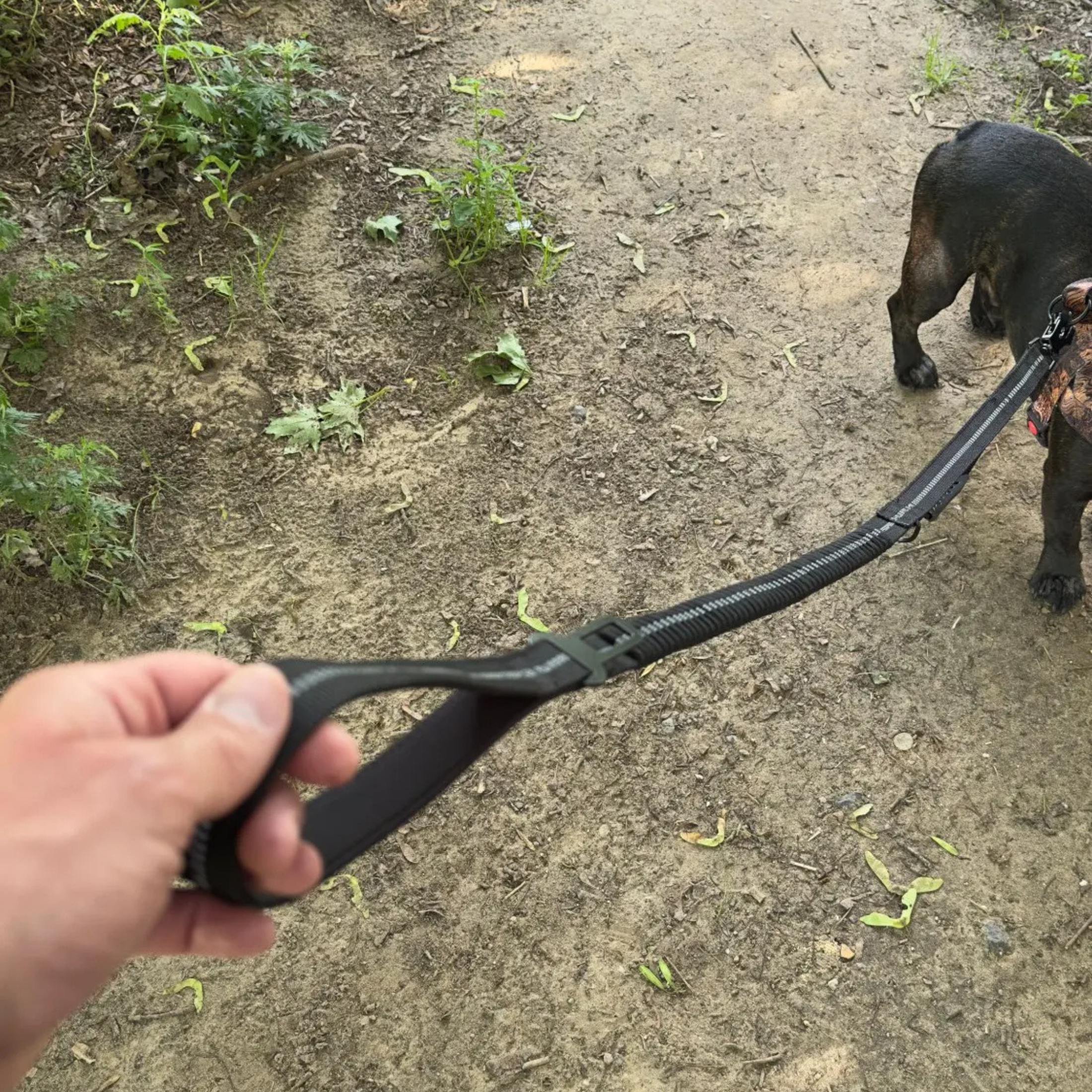 "This lead is strong but has just the right amount of give. The shock absorption really makes a difference, no more sudden yanks on my arm when my dog spots a squirrel!"